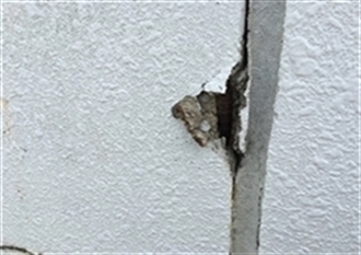 足場仮設が終わったらまずやる事は調査です。打診棒という棒でモルタル、タイル面を叩いて浮きや剥離を調べます。あとは目視にて、ひび割れや爆裂部、欠損部を見つけて見やすくペンやチョークなどでマーキングします。どこに、どのような補修が必要かを見極める事になります。