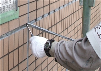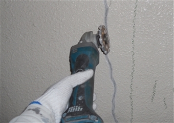 漏水の危険があるひび割れや0.3ミリ以上のひび割れには「Uカットシール」を施します。ひび割れに沿ってグラインダーなどの電動工具でU字形の溝を掘ることをUカットといいます。掘った溝に弾性シーリング材を充填し、雨水の侵入を防ぐと共に、ひび割れの挙動に追従させる事ができます。
